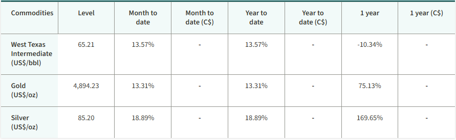 Geopolitical tensions escalated at the beginning of 2026, heightening uncertainty towards the global economy, financial markets and commodity prices. Early in January, the U.S. seized Venezuelan President Nicolas Maduro. After the seizure, President Trump said the U.S. was dedicated to reigniting oil production in Venezuela. He said that he would be responsible for early production and use the proceeds to benefit the people of Venezuela and the U.S. Trump also conveyed his interest in taking over Greenland from Denmark. Since taking office last year, President Trump has been steadfast in his desire to take control of Greenland for international security purposes, particularly from Russia and China. Denmark and the EU pushed back. Trump then threatened tariffs on the EU members if they don’t cede control of Greenland. The EU said it would be willing to impose retaliatory tariffs of its own. Then, at the World Economic Forum, tensions appeared to simmer after Trump spoke with Mark Rutte, Secretary General of the North Atlantic Treaty Organization (NATO). There appeared to be agreement that the U.S. can increase its military presence in Greenland, including the construction of “Golden Dome” missile defence system. The threat of tariffs was then rescinded. Over the month, protests in Iran escalated, largely in response to surging inflationary pressures. The Iranian government took actions to halt the protests, drawing the ire of the U.S. Geopolitical tensions and uncertainty about the global economy helped push several commodities to new record highs, including gold, silver and copper. Gold, in particular, may still see some upward momentum as economic, trade and geopolitical uncertainty linger.